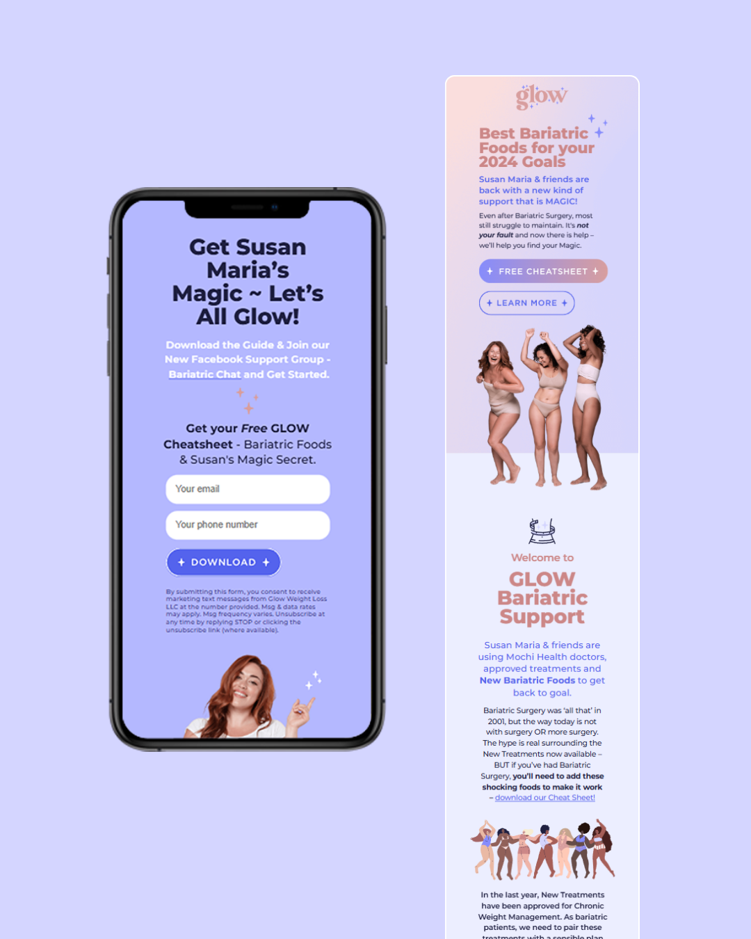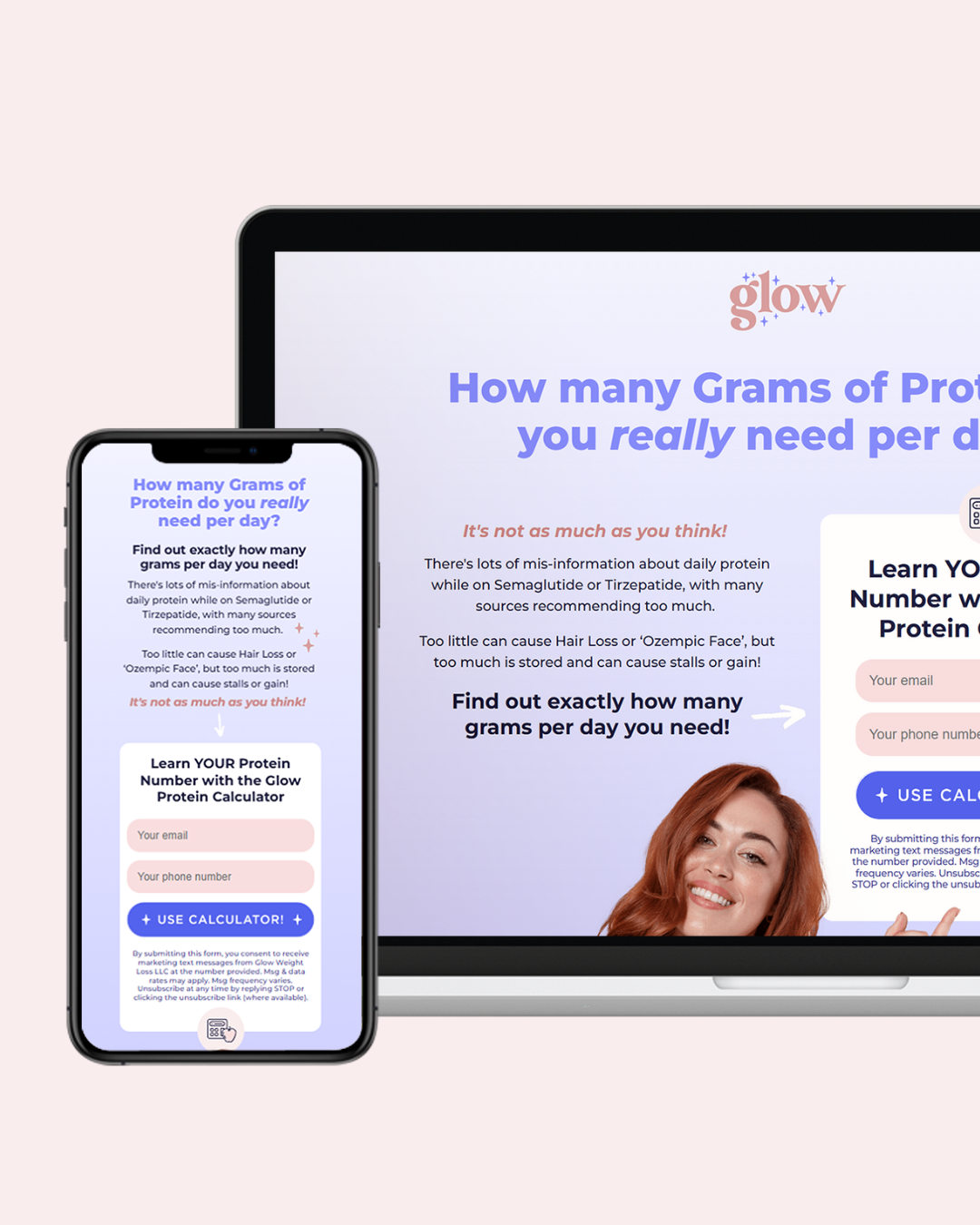 We designed two core landing pages for lead generation: the Free Cheatsheet page and the Protein Calculator page. Both pages were structured to answer three questions immediately — what Glow is, who it’s for, and what to do next — using clear hierarchy, short education blocks, and direct calls-to-action.